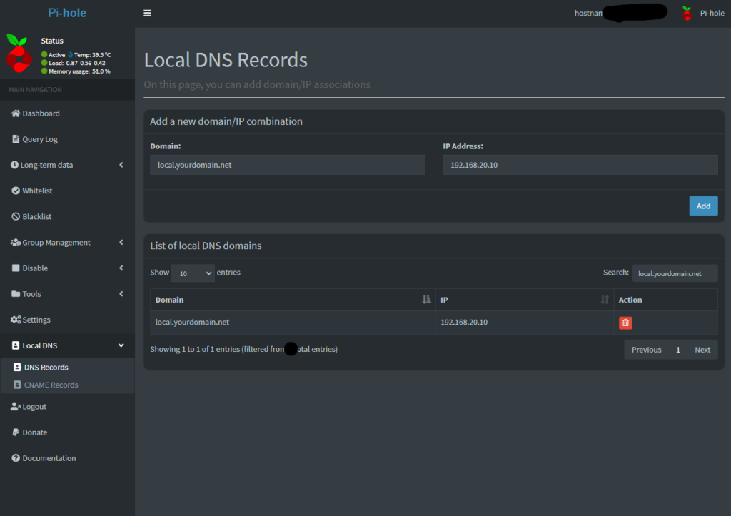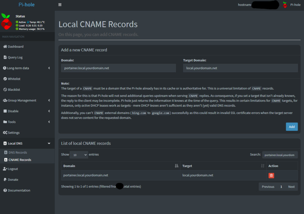 The last step to do is add a CNAME record for our local service. For example, I will be adding the domain name of “portainer.local.yourdomain.net” and targeting the domain of “local.yourdomain.net” so the DNS server knows where to direct the traffic when it gets a request for the portainer subdomain.