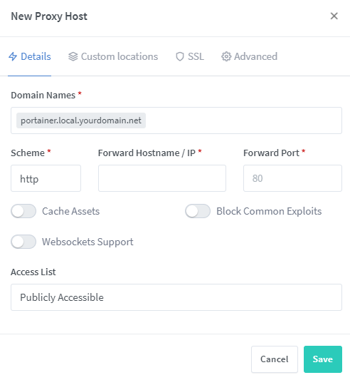 - Put the desired subdomain preceding your “local.yourdomain.net”. Example: portainer.local.yourdomain.net