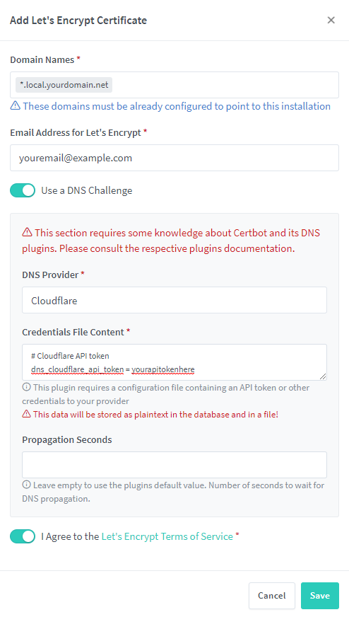 - Click on the “Use a DNS Challenge” box, along with the “I Agree to the Let’s Encrypt Terms of Service”